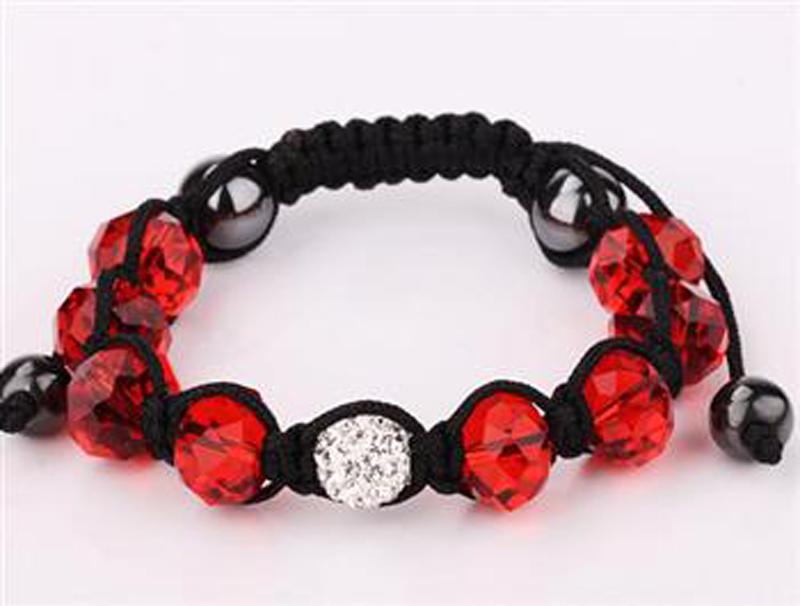 Описание: Плетёный браслет из белого шара с кристаллами, глянцевых шаров и красных прозрачных гранёных камней.