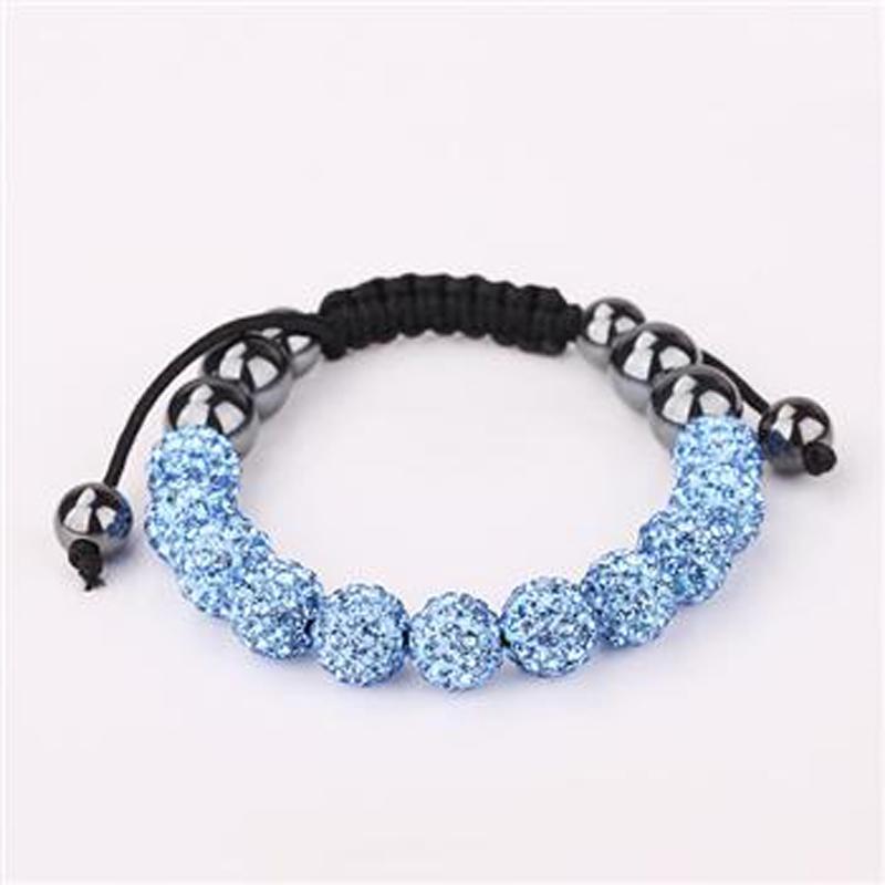 Описание: Плетёный браслет из голубых шаров с кристаллами, дополнен серыми глянцевыми шарами.