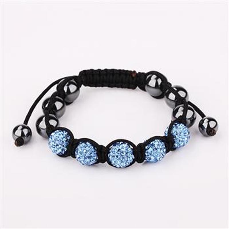 Описание: Плетёный браслет из пяти голубых шаров с кристаллами и серых глянцевых шаров в переплете.