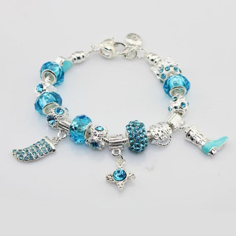 Описание: Браслет комбинированный из декоративных бусин, голубых бейлов с подвесками, с кристаллами и покрытыми эмалью