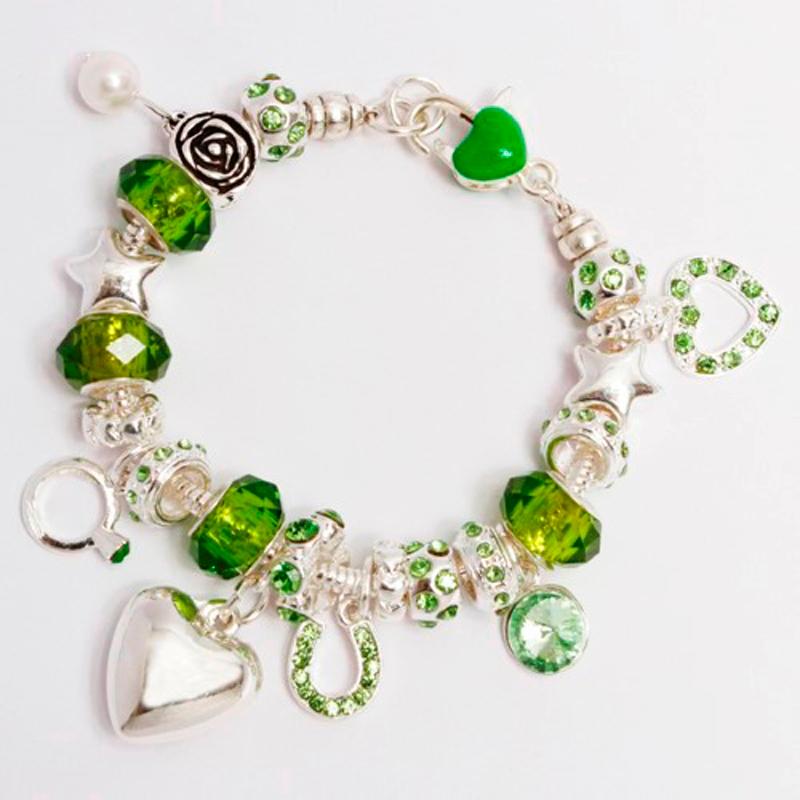 Описание: Браслет комбинированный из декоративных бусин, зеленых бейлов с подвесками и жемчугом, с кристаллами и покрытыми эмалью.