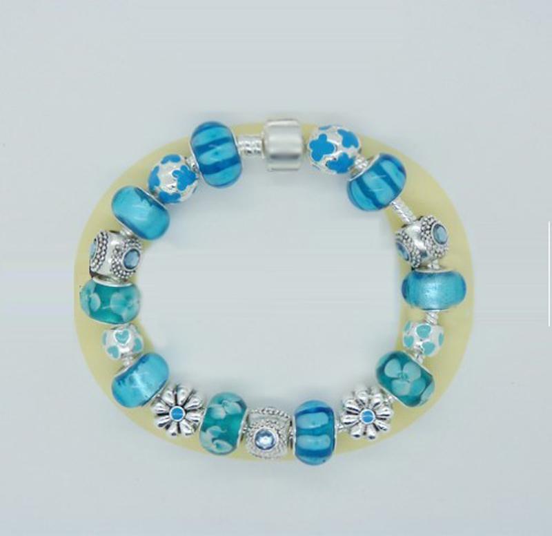 Описание: Браслет комбинированный из декоративных бусин, оригинальных голубых и белого золота бейлов с подвесками и кристаллами.