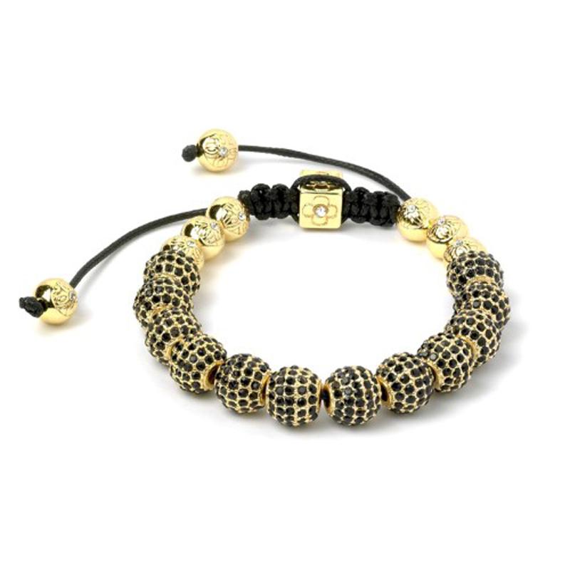 Описание: Плетёный браслет из золотых шаров с черными стразами и декоративных золотых шаров с узорами, украшенными белыми стразами. Стильный и модный аксессуар.